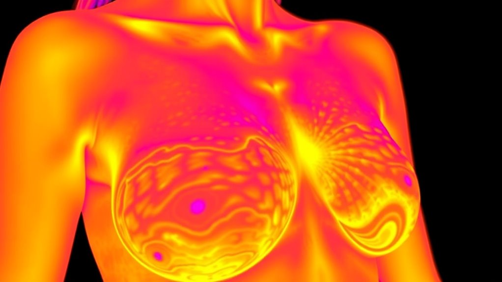 Sich ausschließlich auf Thermographie zu verlassen, kann zu einer hohen Anzahl von Falsch-positiv-Ergebnissen führen, was bedeutet, dass Sie alarmierende Hitzeverteilungen erhalten könnten, die tatsächlich nicht mit Krebs in Verbindung stehen. Diese Fehlalarme können unnötige Angst auslösen und Sie dazu veranlassen, invasive Tests wie Biopsien oder zusätzliche Bildgebungen durchzuführen, die sich letztendlich als unnötig herausstellen. Da die Thermographie Oberflächentemperaturänderungen erkennt, die durch Entzündungen, Infektionen, hormonelle Schwankungen oder gutartige Zustände verursacht werden, fehlt ihr die Spezifität. Das bedeutet, dass viele gutartige Probleme verdächtig erscheinen können, was die Wahrscheinlichkeit von Falsch-positiven Ergebnissen erhöht. Allein auf die Thermographie zu vertrauen, kann zu Überdiagnosen, unnötigen Eingriffen und emotionalem Stress führen. Ohne die Bestätigungsdetails, die durch Mammographie oder andere bildgebende Verfahren bereitgestellt werden, können diese Falsch-Positiven Ihr Seelenheil beeinträchtigen und zu ungerechtfertigten Behandlungen führen. Zusätzlich kann das Verständnis von diagnostischer Genauigkeit helfen, die Bedeutung der Kombination von Thermographie mit bewährten bildgebenden Techniken für zuverlässigere Ergebnisse zu betonen.