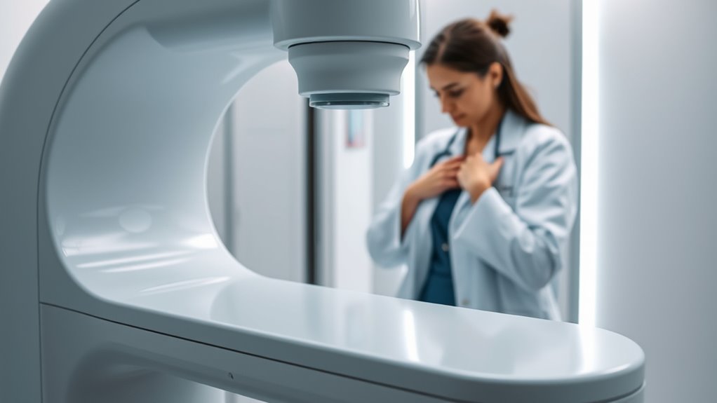 Obwohl das Mammographie-Screening Vorteile bietet, birgt es auch psychologische und körperliche Risiken, die nicht übersehen werden sollten. Sie könnten Angst durch Falsch-positive Ergebnisse erleben, was zu unnötigen Tests und Sorgen führen kann. Wenn Ihre Ergebnisse eine Anomalie anzeigen, könnten Sie Biopsien oder andere invasive Verfahren durchlaufen, die Risiken wie Schmerzen, Blutungen oder Infektionen mit sich bringen. Überdiagnose kann ebenfalls emotionalen Stress verursachen, da Sie möglicherweise gegen eine Krankheit behandelt werden, die keinen Schaden anrichten würde. Außerdem wirft wiederholte Exposition gegenüber niedrig dosierter Strahlung Bedenken hinsichtlich möglicher langfristiger Auswirkungen auf, obwohl diese selten sind. Die emotionale Belastung durch Fehlalarme, kombiniert mit den körperlichen Unannehmlichkeiten durch Screening und Folgeuntersuchungen, kann Ihr Wohlbefinden erheblich beeinträchtigen. Kontrastverhältnis spielt eine entscheidende Rolle bei der Bildqualität, und ähnliche Prinzipien gelten in der medizinischen Bildgebung, indem sie die Klarheit der diagnostischen Bilder beeinflussen. Es ist wichtig, diese Nachteile gegen die Vorteile abzuwägen, wenn Sie eine Entscheidung über das Screening treffen.
